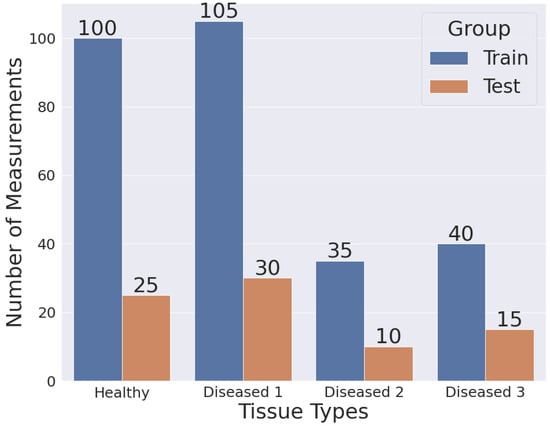 We used the 501 points generated by real permittivity and 501 points generated by imaginary permittivity to create a 1002 feature vector for each measurement. From the 72 mouse tissue samples, we collected a total of 360 measurements for developing and testing our machine learning models. The measurements were divided into two independent datasets: training and testing. We divided the data such that measurements from a single sample were present in only one of the two sets. We did this to avoid the data leak of the same tissue sample in both training and testing sets using GroupShuffleSplit(), a function available in scikit-learn []. The function was also used to ensure that the number of samples in each set had similar class distribution. Figure 5 shows the number of measurements in the train and test sets.