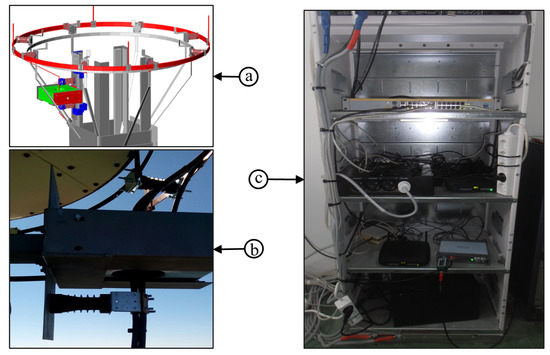 Measuring equipment on the site: (a) 3D view of the mounting of the current transformer, (b) current transformer, and (c) recording unit and power supply unit.