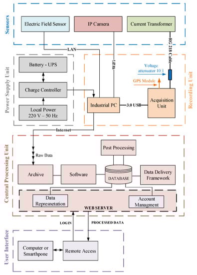 The lightning measurement system was constructed from a sensor, recording unit, power supply unit, central processing unit and user interface. A installed hardware is presented in Figure 3, while detailed block diagram of the system is shown in Figure 4. The sensor unit containing current transformer, electric field sensor and IP camera, was installed on tower top.
