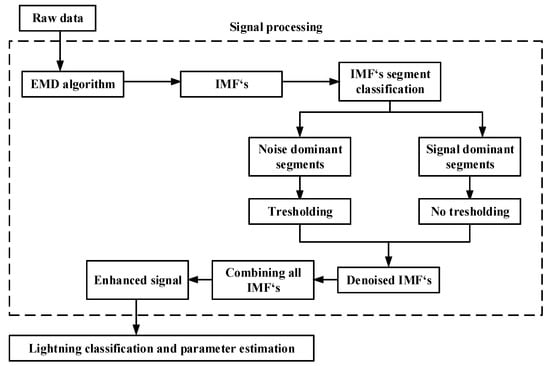 In the recent literature on lightning research, processing techniques are insufficiently considered. Several established methods are frequently reported: the Fourier transform, the short Fourier transform (STFT) [14], and the wavelet transform (WT) [15,16]. In [17], a time domain digital processing system for lightning current waveform parameters extraction is described. Using this approach procedure for parameters extraction from negative lightning flash with only one stroke was developed. In [18,19,20], the authors use Empirical Mode Decomposition (EMD) for discharge electric field pulse analyses, but in the recent literature, this method was not used for lightning current waveshape analyses. Therefore, this paper proposes a novel approach for analyzing lightning current waveform parameters and it is based on EMD. Continuing the work in [17], the authors expanded capabilities of previously developed signal processing procedure in terms of introducing new algorithm, increasing number of analysed features and including all typical types of discharges.