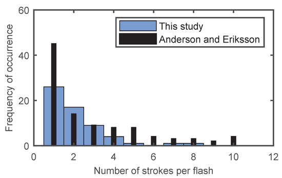 As can be noted from Table 3, 59 first negative strokes and 86 subsequent negative strokes were analyzed. For the purpose of such analysis novel proposed processing method was used. The statistical distribution of multicomponent lightning flashes recorded in this study and compared with Anderson and Ericson (in [22]) is given in Figure 6. The frequency of the occurrence of multicomponent flashes in this region is very similar to that of Anderson and Ericson which is widely accepted.