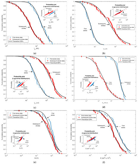Cumulative statistical distributions of first and subsequent negative stroke currents—measured data and theoretical CDFs: (a) Peak stroke currents, (b) Front times, (c) Tail times, (d) Maximum steepness, (e) Stroke charges, (f) Specific energies.