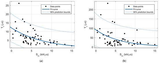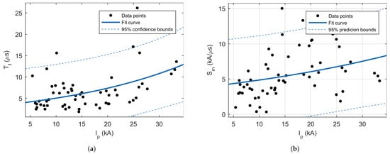 Similarly, as it is published in the literature, in this study, a correlation between peaks current and front time was observed. Additionally, a similar correlation exists between the peak current and maximum steepness (see Figure 9), with a similar correlation coefficients in available literature. As expected, a very strong correlation was observed between the peak current and total charge and specific energy. An interesting observation is that both the front and tail time are negatively correlated with steepness (see Figure 10).