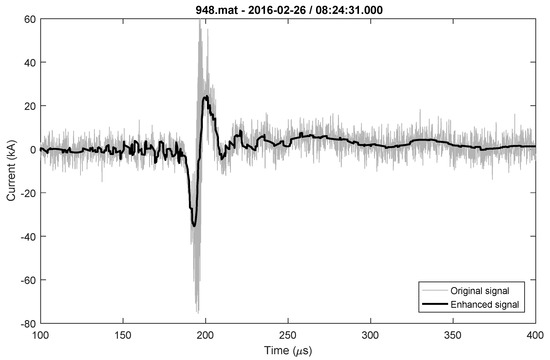 Negative multicomponent lighting flash (flash consists of four strokes) original and enhanced signal.