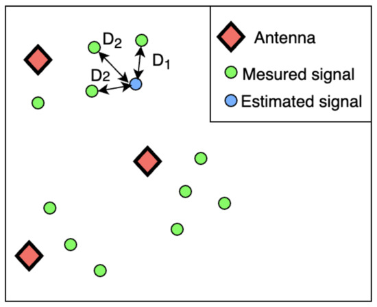 However, some are simpler to implement and provide acceptable short calculation time. The KNN algorithm is a “lasy learning” machine learning method [82,83]. This algorithm estimates a point’s value according to its neighboring by computing average distances between instances, as shown in Figure 4 and Equation (1). We assume this concept is suitable for signal estimation on geolocated nodes inside a deployment area. For example, if neighbors B and C of node A have a good-quality signal, we can assume that node A will also have a good-quality signal without considering all nodes inside the deployment area.