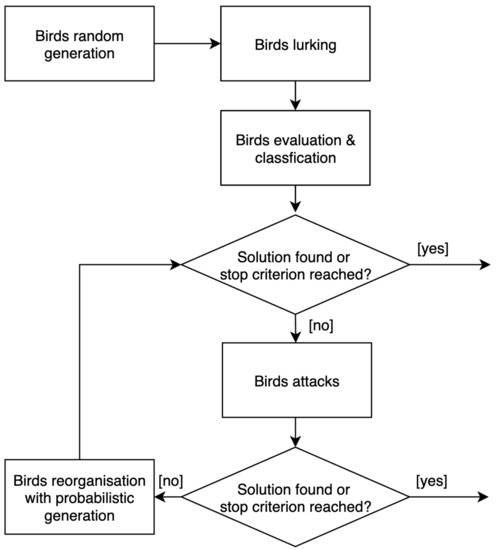 As summarized in Figure 5, the algorithm starts with a random solution generation phase. A lurking phase is performed to avoid too-fast convergence of the algorithm towards a local minimum. It allows for the birds to move away from the best bird , allowing the search to diversify.