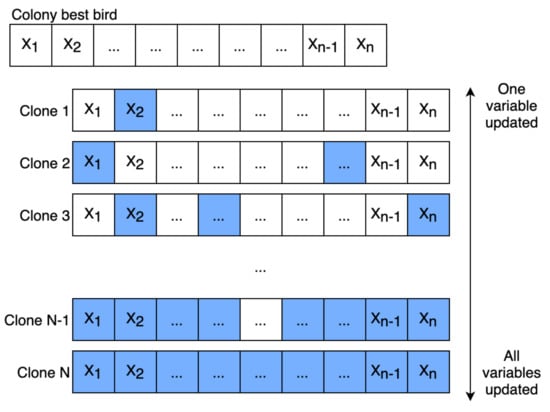 In the classical version of the algorithm, the best bird does not evolve during iterations. In the I-HBIA algorithm, we have therefore chosen to add a step that runs in parallel with the different attacks: “cloning the best bird,” as described in Figure 6. This step consists of duplicating the best bird a number of times corresponding to the number of dimensions studied. For example, a problem of dimension 50 will generate the creation of 50 clones. These clones will be more or less faithful replicas of the best bird. Indeed, they will be subjected to random perturbations. Each clone will be assigned a mutation number corresponding to its replication number, as shown in Figure 7.