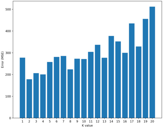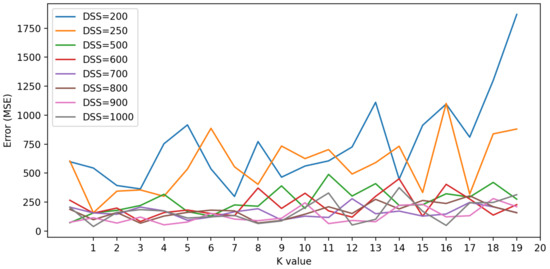 KNN algorithm parametrization is a complex task generally based on empirical observations. The parameter K is the number of considered neighbors to estimate the signal quality. If the amount of measured data is limited, the algorithm’s performance can be volatile and challenging to measure, as shown in Figure 8. We can see in this figure that the prediction precision is variable when the algorithm works with 200 or 250 measured values. The volatility of results is less intense in scenarios where we have a large volume of data, such as 900 or 1000 measured values.