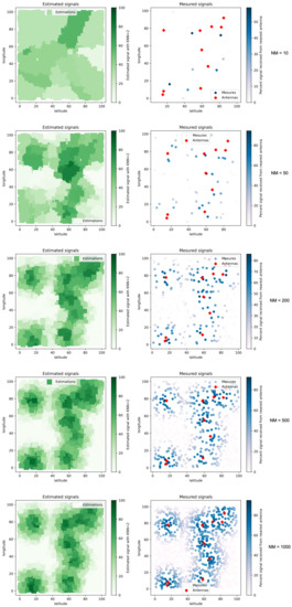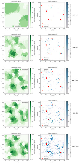On the map shown in Figure 11, we also observe that the KNN algorithm performs well for estimating signals. We also notice that the amount of measurement data also conditions the accuracy of the predicted signals. This aspect is even more critical because some interfered areas might not be detected without a sufficiently large number of measurements. This aspect would lead to wrong signal quality predictions. For example, we can see in the figure that signal perturbations are not correctly estimated in the upper right corner of the map (NM = 10 to NM = 200). These perturbations are only estimated from a considerable number of measurements (NM = 500 and NM = 1000).