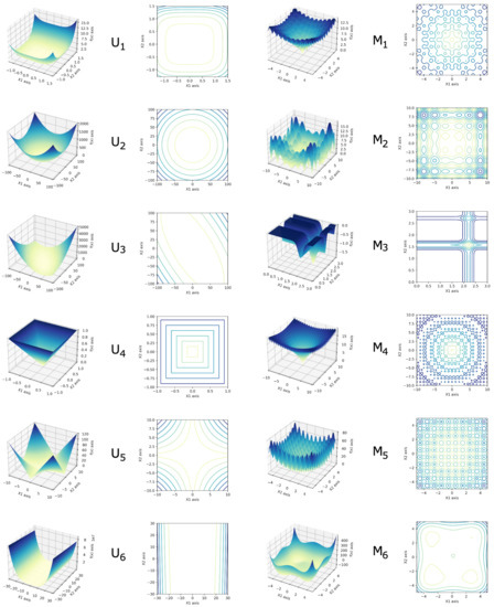 We evaluated the performances of these two algorithms on unimodal benchmark functions, presented in Table 5, and multimodal benchmark functions, shown in Table 6. The evaluation space of the unimodal and multimodal functions with two dimensions can be seen in the 3D graphs in Figure 13.
