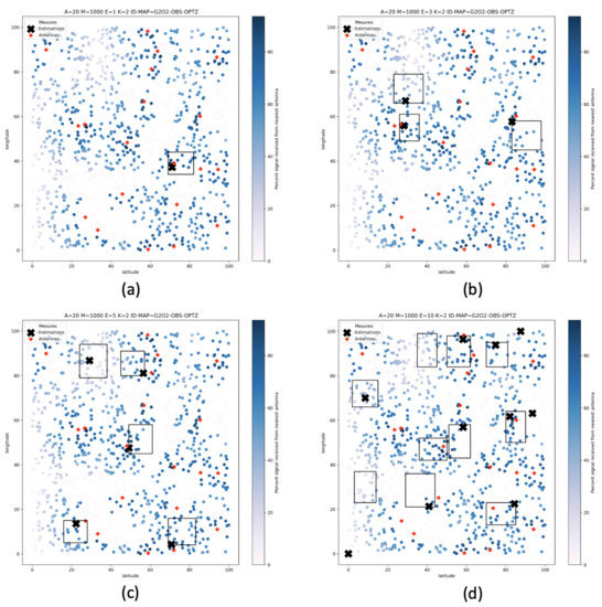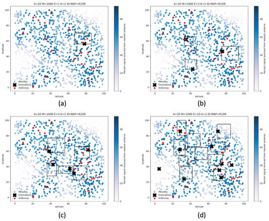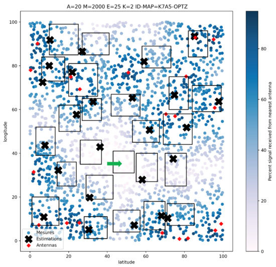 Figure 10 demonstrates the functioning of the KNN algorithm with a parameterization of K = 2. On this map, we can easily observe that the quality of the accuracy is strongly correlated to the number of available measurements. We can observe a high accuracy from 200 measures (NM = 200).