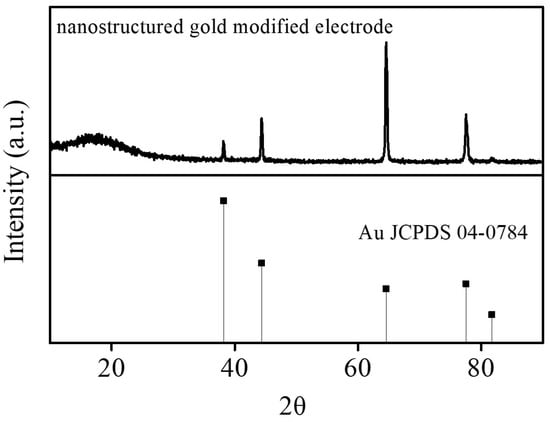 The structure and phase composition of the nanostructured gold-modified electrode were characterized using XRD pattern in comparison with the standard patterns of Au (JCPDS No. 04-0784) [24], as shown in Figure 2. The XRD result of the nanostructured gold-modified electrode revealed typical Au reflection peaks at 2θ = 38.3°, 44.5°, 64.6°, and 77.6°, which corresponded to the (111), (200), (220), and (311) lattice planes of Au. The average crystallite/particle size of deposited Au on the nanostructured gold-modified electrode was then estimated from the Debye-Scherrer equation in the XRD data [25].