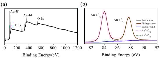 The surface elemental composition and valance states of the nanostructured gold-modified electrode were characterized using XPS, as shown in Figure 3. The Au 4f, C 1 s, Au 4d, and O 1s elements could be identified in the full survey spectra for the nanostructured gold-modified electrode (Figure 3a), which confirmed the attachment of Au nanoparticles on the surface of the bare Au electrode. In order to further characterize the chemical states of the Au element on the nanostructured gold-modified electrode, it was characterized in detail by high-resolution Au 4f XPS spectrum. In the high-resolution XPS spectrum of the Au 4f region (Figure 3b), the nanostructured gold-modified electrode exhibited the Au 4f split peaks at 84.0 eV and 87.7 eV, accounting for Au 4f7/2 and Au 4f5/2, respectively, thus, confirming the existence of metallic Au nanoparticles on the nanostructured gold-modified electrode [26].