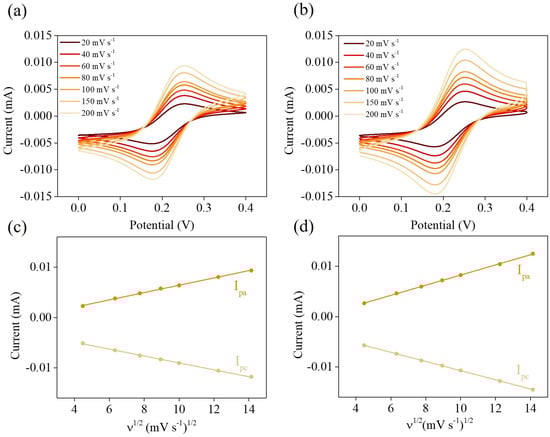 To further elucidate the electrochemical behavior of nanostructured gold modified on the Au electrode, we measured electroactive surface areas using the Randles–Sevcik equation. Figure 5 displays the CV curves of the bare Au electrode (Figure 5a) and nanostructured gold-modified electrode (Figure 5b) in ferricyanide solution (1 mM) containing 0.1 M KCl at different scan rates from 20 to 200 mV s−1. It is shown that the peak current increases with increasing scan rate, with anodic peak current (Ipa) and cathodic peak current (Ipc) increasing linearly with the square root of the scan rate (υ1/2), see Figure 5c,d. The linear regression equations for the bare Au electrode and nanostructured gold-modified electrode could be expressed as Ipa (Ipc) (μA) = −0.85 (−2.16) + 0.73 (−0.69) υ1/2 ((mV s−1)1/2) (R2 = 0.999 (0.999)) (bare Au electrode) and Ipa (Ipc) (μA) = −1.81 (−1.62) + 1.01 (−0.91) υ1/2((mV s−1)1/2) (R2 = 0.999 (0.999)) (nanostructured gold-modified electrode), respectively. According to the following Randles–Sevcik equation [29], Ipa(Ipc) = 2.69 × 105 n3/2AD1/2C0υ1/2, D is the diffusion coefficient of ferricyanide (D = 7.6 × 10−6 cm2 s−1 for ferricyanide), Ipa (Ipc) is the anodic (cathodic) peak current (A), C0 is the concentration of the ferricyanide (10−6 mol cm−3), A is the electroactive area (cm2), n is the number of transferred electrons, and υ1/2 is the square root of scan rate ((V s−1)1/2). The calculated electroactive area is 0.030 and 0.042 cm2 for the bare Au electrode and nanostructured gold-modified electrode, indicating that the nanostructured gold-modified electrode has relatively high electrocatalytic active sites compared with the bare Au electrode, which would greatly enhance the electrochemical sensing performance.