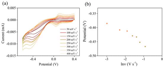 To confirm the reaction mechanism of MP involving the irreversible reduction reaction from the nitrophenyl group (−NO2) on MP capturing four electrons to form the hydroxylamine group (−NH–OH), the Laviron equation given for the irreversible electrode process was used. Figure 6a displays the CV curves of the nanostructured gold-modified electrode in the 20% acetonitrile and 0.1 M PBS in the presence of 4 ppm MP at different scan rates from 50 to 400 mV s−1. It is shown that a negative shift in the irreversible cathodic peak potential with increasing scan rates is obtained (Figure 6a). Figure 6b shows that a plot of logarithm of the scan rate (lnν) vs. the irreversible cathodic peak potential is linear, and the linear regression equations could be expressed as Ep (V) = −0.493 − 0.038 lnν(V s−1) (R2 = 0.927). According to the following Laviron equation [30], Ep = E0 + (RT/αnF)ln(RTk0/αnF) + (RT/αnF)lnυ, Ep is the peak potential (V), E0 is the formal peak potential (V), R is the universal gas constant (8.314 J mol−1 K−1), T is the temperature (298 K), α is the charge transfer coefficient, n is the amount of electron transfer, F is the Faraday constant (96,500 C mol−1), k0 is the standard heterogeneous electron transfer rate constant, and υ is the scan rate (V s−1). The calculated values of αn and n further confirmed that the reaction mechanism of MP for the nanostructured gold-modified electrode involving the irreversible reduction undergoes a four-electron transfer process in electrochemical MP sensing.