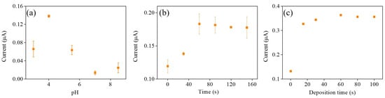 The optimization of nanostructured gold-modified electrode in the presence of MP with (a) the pH of electrolyte solution, (b) the adsorption time of pesticide, and (c) the electrodeposition time of nanostructured gold (the error bars represent the standard deviation of 3 repeat measurements).