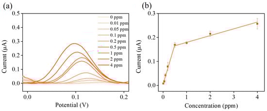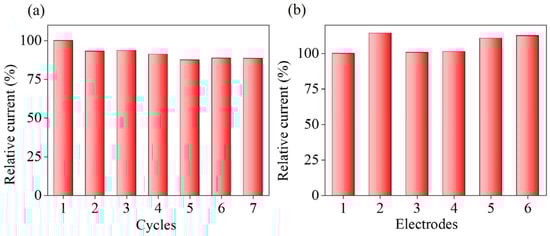 Subsequently, to further evaluate the stability of the nanostructured gold-modified electrode, the repeatability (Figure 10a) and reproducibility (Figure 10b) of the electrode were examined to assess the efficiency of the electrode by recording the peak current response of 4 ppm MP in the 20% acetonitrile and 0.1 M PBS. The repeatability was examined using seven consecutive measurements. The relative standard deviation (RSD) of the nanostructured gold-modified electrode was 4.73%. The reproducibility was examined utilizing six different electrodes prepared with the same method and the RSD obtained was 6.16%, demonstrating that this proposed electrode presented satisfactory stability and could be used as a realistic feasible electrode material for MP sensing.