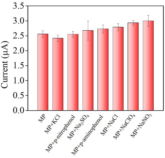 The selectivity is a key factor to evaluate the sensing capacity of the electrode in practical applications. To demonstrate the selectivity of the nanostructured gold-modified electrode for MP sensing, the effect of possible inorganic ions (such as Na2SO4, KCl, NaCl, NaClO4, NaNO3) and electroactive nitrophenyl derivatives (such as p-nitrophenol and p-aminophenol) on the analytical response of the designed electrode was examined. In Figure 9, the DPV peak current response of the nanostructured gold-modified electrode displays an acceptable interference effect via the addition of possible interfering species (with concentrations 10-fold higher than the MP) in the presence of 1 ppm MP. The calculated relative standard deviation (RSD) is 7.36%. Such results still achieved an accepted target value of RSD because most existing pesticide residue analytical methods with the values of RSD < 20% [38] illustrated that there were many challenges remaining in the field of pesticide residue analysis. This could further stimulate researchers to promote the continued transformation of scientific and technological achievements on the analysis of pesticide residues in agricultural products.