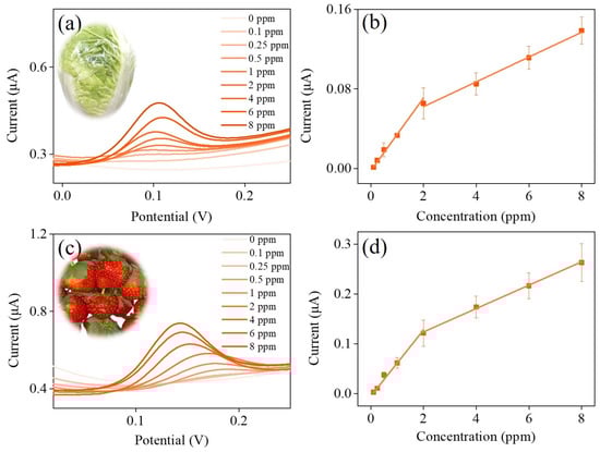 Real sample analysis of (a) bok choy and (c) strawberry. The plot of the DPV peak current response of (b) bok choy and (d) strawberry versus the increased MP concentration (the error bars represent the standard deviation of 3 repeat measurements). The inset of (a,c): photographs of bok choy and strawberry.
