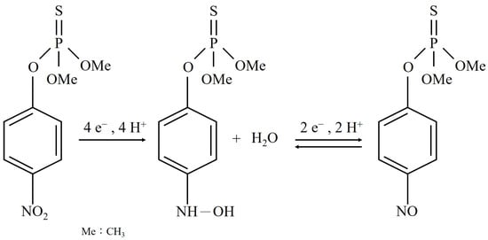Anandhakumar et al. reported that atomic gold was successfully structured on the surface of a gold electrode using the electrodeposition method for constructing non-enzymatic electrochemical methyl parathion sensing. Atomic gold structured on a gold electrode possessed high surface to volume ratio, large binding sites, electronic effect, and a mixed diffusion regime to enable further improvements in the performance of electrochemical sensing for determining methyl parathion [18]. Junior et al. also reported that sensitive and selective non-enzymatic electrochemical methyl parathion sensing at the fabrication of nanoporous gold on a gold electrode was prepared successfully by using anodization followed by the electrochemical reduction method. The excellent pesticide sensing performance could be ascribed to enhancing the electroactive surface area of nanostructured electrodes that increased the number of catalytic sites and crystalline facets in this nanoporous gold film structure to maximize its catalytic performance for further application to non-enzymatic methyl parathion sensing [21]. As reported in previous studies on the mechanism of non-enzymatic electrochemical methyl parathion sensing, methyl parathion was initially electrochemically irreversibly reduced with a cathodic scan following the direct electron transferring process (4e− and 4H+) from the conversion of nitro (–NO2) on methyl parathion to hydroxylamine group (−NH–OH). Subsequently, the hydroxylamine group (−NH–OH) on methyl parathion could be reversibly oxidized and reduced with the nitroso group (–NO) by the reversible transformation of 2e− and 2H+ [21,22,23].