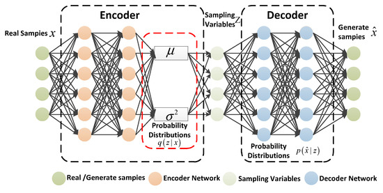 is the real sample, is the hidden variable, and denotes the output of the decoder. Moreover, represents the parameters in the encoder, and represents the parameters in the decoder. Furthermore, and represent the mean and variance of the approximate posterior probability distribution of . Specifically, is an observable random vector of the high-dimensional space, and is an unobservable random vector of relatively low-dimensional space. The high-dimensional represents the observable -space in the VAE model. The low-dimensional representation decoder reduces the dimensionality of the hidden variable . The VAE model sample generation is divided into two processes: the encoder infers the approximate distribution process of the hidden variables, and then the decoder restores the hidden variables to a process similar to the probability distribution of the input sample. denotes the approximate posterior probability distribution of .