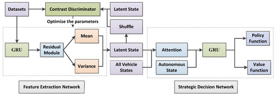 Liu et al. adopted VAE + RNN to infer drivers’ potential features from the trail of vehicles. However, the VAE network is restricted to deducing the abilities of potential features. We introduced contrastive learning and residual modules based on the VAE + RNN network. Meanwhile, we leveraged C-ResNet-VAE + RNN networks to extract the potential states of various drivers from original driving trails and clusters in an unsupervised way. Figure 3 shows the whole framework of the network. Both datasets and unsorted potential states were simultaneously inputted to the contrastive learning classifier, and contrastive losses were calculated. The contrastive learning classifier optimized encoded parameters in a back propagation way. Then, potential features with the learned features of drivers and all the states of the vehicles to a navigation strategy were submitted. The strategy network contained the GRU network with an attentive module, trained by model-free reinforcement learning. According to inferred features, autonomous vehicles adjusted strategies when interacting with a variety of drivers to perform efficiently.