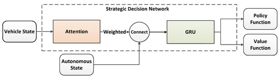 As shown in Figure 6, the decision-making module is a GRU network with an attention module. The vehicle status includes the potential characteristics of the driver, all observable vehicle site coordinates, and the site and speed of the autonomous vehicle. Here is how it works. First of all, the vehicle status is inputted to the attention module, which distributes the attention weight to every surrounding vehicle. Then, the weight characteristics counted by each vehicle and the site and speed of the autonomous vehicle are fed into the GRU network. Finally, the hiding states in the GRU network are put into a full connected layer to obtain the value function and the policy function. In this paper, we used a policy gradient method of model-free intensive learning, which we called the proximal policy optimization (PPO) algorithm, to learn the value function and policy function [26] and utilized the approach in this literature [27] to achieve the PPO algorithm.