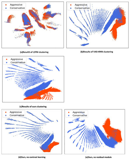 From the results in Figure 7c–e, it can be seen that there are significantly more blue blocks in the red area without the addition of the contrast discriminator module and the residual module, and there are still many driving trajectories with different potential features fused together. With the addition of the contrast discriminator module and the residual module, the separation ability is enhanced, and the clustering effect is better. Thus, the effectiveness of the method is verified.
