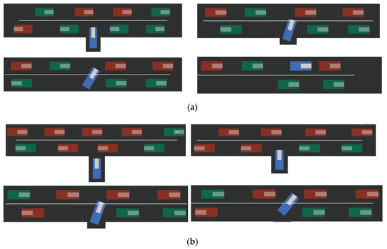 At time t + 1, it can be seen from Figure 8b that the autonomous vehicle successfully identified the red aggressive vehicle when passing the drop-off lane and passed the green conservative vehicle when it encountered it. The unsuccessful recognition of the red aggressive vehicle at the entry lane resulted in a collision.
