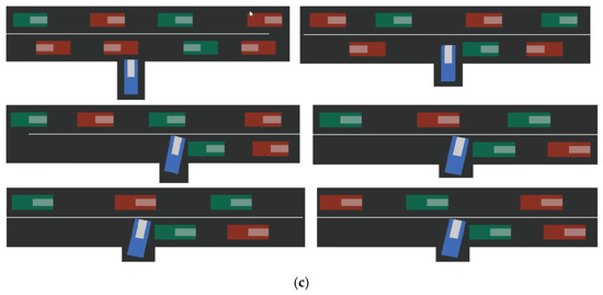 At time t + n, it can be seen from Figure 8c that the autonomous vehicle recognized the red aggressive vehicle when passing the drop-off lane and passed the green conservative vehicle when it encountered it; however, failed to make a judgment when it was about to enter the drop-off lane and failed to take action, resulting in a timeout. Timeout n was set to 50 s.