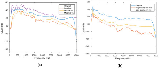 Spectral analysis of original and re-recorded speech. (a) Original and re-recorded speech using telephone channels (CSJ eval1 dataset), (b) Original and re-recorded speech using wireless pin mic channels (CSJ eval3 dataset).