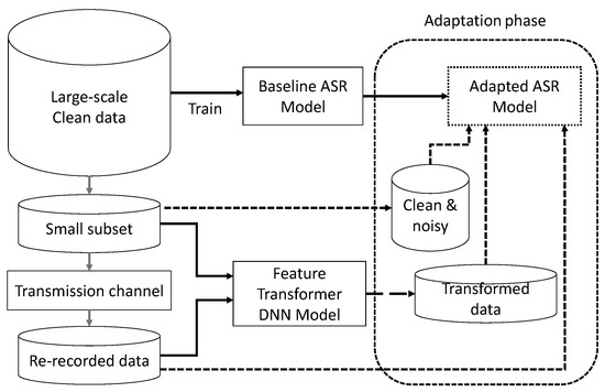 There is previous research on how to improve the acoustic model’s performance for real data. According to it, one method to achieve improvement is to perform domain adaptation. To perform domain adaptation for real-world data, data augmentation is often used. Previous research on this subject shows data augmentation by adding various recorded noises at the desired SNR level, performing speed perturbation on clean data, or using room impulse responses (RIR) to simulate the desired room acoustics. These augmented data contribute to producing improved performance of ASR systems for the target domain, as stated in [1,2,3,4]. Moreover, there are DNN-based data augmentation methods which extract acoustic information to represent acoustic environments instead of creating simulated data, which are explained in [5].