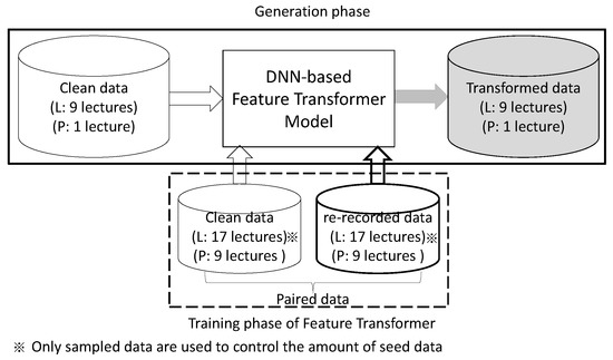 We train the feature transformer, as depicted in Figure 6, using the 17 recordings, excluding 9 recordings that are used to generate transformed features for fine-tuning. We use only 553 utterances at most for training the feature transformer model, which we obtain by filtering out temporally mismatched utterances from 17 pairs of clean-re-recorded data. We prepare 5 sets of training pairs with durations of 0.2, 0.5, 1.0 and 1.5 h (equivalent to the size of seed mentioned in Section 3.1.2) from the set by picking a subset of utterances from 17 speakers. We train these models for validating our proposed method. For comparing the performance in general, we use the largest seed of 1.5 h.