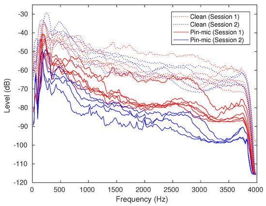In Figure 9, we show the spectral analysis of pin mic re-recordings opposed to their original counterparts. In the figure, we show the spectrum of the recordings divided in two groups according to the sessions they were recorded in. The first session is depicted by red lines and the second session is depicted by blue lines. This analysis shows us the problem of significant difference in level (dB) of re-recorded speech between two recording sessions.