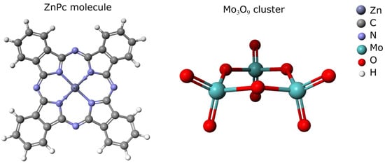 All semi-empirical calculations were performed using the PM6 method with the MO-G simulation in the SCIGRESS software package (version FJ 2.8 EU 3.2.2.). The simulations were carried out for a single molecule of ZnPc and a Mo3O9 cluster (Figure 1) with one molecule of analyte gas. The adsorption energies on ZnPc and MoO3 for each analyte gas were determined from Equation (1).