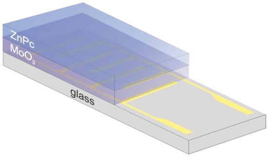 The diagram of the sensing structure: the thin layer of ZnPc layer deposited on the glass substrate with gold electrodes, coated with an MoO3 layer.