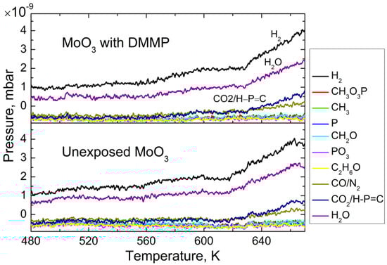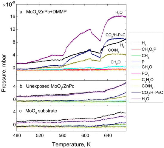 The survey TDS spectra for DMMP-exposed MoO3/ZnPc, unexposed MoO3/ZnPc and bare MoO3 structures are presented in Figure 3a–c, respectively. Figure 3 shows the spectra of the DMMP-exposed MoO3 substrate in comparison with unexposed MoO3. The traces are in both cases identical; thus, we can assume that the desorption products from the MoO3 substrate do not include the degradation products of DMMP. As DMMP desorption from the ZnPc layer is crucial for this study, the discussion will be focused on the spectra of the DMMP-exposed MoO3/ZnPc structure. In Figure 3a, one can note that among the monitored atomic masses, the desorption of particles with masses of 2, 18, 28, 31, and 44 amu was observed at temperatures above 500 K. Importantly, only one of the desorbing species can be clearly assigned as a DMMP decomposition product—30 amu, formaldehyde (CH2O). All the other species desorb from the unexposed MoO3/ZnPc structure, as well as from the bare MoO3 substrate (Figure 4b,c). The atomic masses of 2, 18, 28, and 44 amu can be assigned to the air-related impurities, such as H2, H2O, CO/N2, and CO2, respectively. However, the partial pressures of those species that desorbed from the DMMP-exposed sample are 2–4-fold higher than in the case of the unexposed sample. Significantly, the character of the desorption trace is different for the DMMP-exposed sample than for the one that remain unexposed, indicating a more complicated nature of the desorption process in the presence of adsorbed DMMP on the ZnPc surface. The following DMMP decomposition products were identified: H2, H2O, CO and CH2O, which could be identified and assigned accordingly, and the mass of 44 amu may be assigned either to CO2, H-C≡P or to both of these species that desorb together.