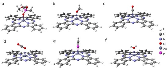 Geometries of ZnPC adducts with: (a) DMMP, (b) CH2O, (c) CO, (d) CO2, (e) PHC, and (f) H2O.