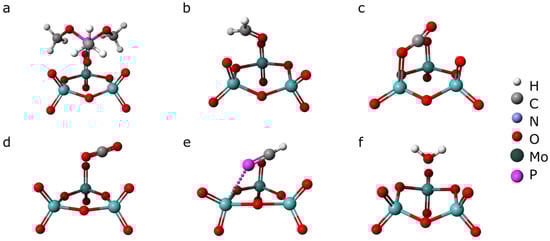 Geometries of MoO3 adducts with: (a) DMMP, (b) CH2O, (c) CO, (d) CO2, (e) PHC, and (f) H2O.
