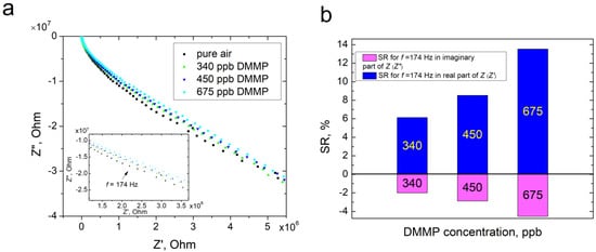 where SR′—sensor response in the real component of impedance, %; SR″—sensor response in the imaginary component of impedance, %; Z′DMMP, Z″DMMP—real and imaginary component of impedance in the presence of DMMP, Ohm; Z′air, Z″air—real and imaginary component of impedance in pure air, Ohm.