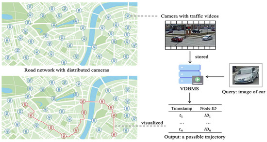 Shahri [8] provided a graph-based approach using the identity of neighboring vehicles to improve the performance of tracking vehicles. Liu [9] proposed a PathRank algorithm to support the vehicle trajectory search. However, the above two methods did not solve the problem of sparsity and noise. In this paper, we study a novel path inference query for a large video database that can be obtained from thousands of surveillance cameras deployed in a city; experiment results validate the efficiency and accuracy of our proposed trajectory recovery framework. As shown in Figure 1, the input to the query is an image of a vehicle or pedestrian, and the goal is to locate its possible footprints and recover its historical trajectory on the road network from visual snapshots captured by cameras. It is an intersection of computer vision and database management. It can be applied to many lives, public security, and criminal scenarios to provide new technical support for smart-city construction and public-security governance [10]. The algorithm can be applied to missing-person tracking, suspicious-vehicle queries, security management prevention, and other fields, providing new technical ideas and support for smart cities and public security. For example, database queries may be used to locate missing persons or stolen cars or to help solve crimes by effectively identifying the travel logs of suspicious vehicles and people.