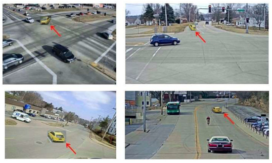 Figure 2 provides an example of injecting the query object (yellow car) into different video clips. The video database preserves the background complexity of the actual scene and the correctly labeled driving trajectories across the cameras follow the real transportation. The video composer proposed was based on real videos and was fast to generate.