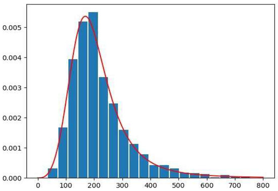 To verify whether the Burr distribution was suitable for the Singapore cab dataset chosen for this paper, we selected the start and end pairs that occurred frequently in all trajectories and plotted the passage time distribution, as shown in Figure 3. It can be seen that the Burr distribution provided a good approximation.