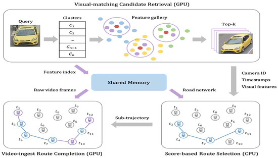 - Score-based route selection. Given the top-k video frames that are similar to the query image, a large number of candidate routes can be constructed from the cameras associated with these video frames. To solve the problem that the search space was too large, we constructed a proximity graph between cameras and proposed a score-based route selection algorithm that was able to efficiently identify routes with high accuracy. Since this process involves complex computational logic and data structures, we implemented the process in a CPU environment.