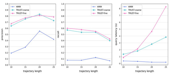 It can be seen that on this smaller dataset, the scale of was correspondingly smaller, and the query time of the three algorithms decreased. The performance of HMM was acceptable in precision, but the recall was too low; the performance of the TRUST-coarse and TRUST-fine algorithms proposed was close. On this dataset, the performance of the accuracy rate declined, because the length of the vehicle trajectory was uncontrollable and short (mostly around 5–7), and correct trajectories did not reflect a greater advantage in the score formula related to path length. showing great advantages. The results were similar to those for a trajectory length of 10 in the Veri-SG dataset.
