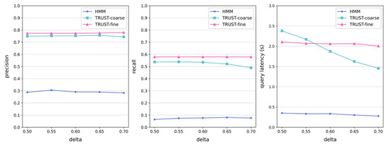 Compared with HMM, the TRUST proposed showed a greater advantage in accuracy within the acceptable range of time. The TRUST-fine was slightly better than TRUST-coarse in both precision and recall, but when the data size increased significantly, the TRUST-coarse was able to reduce the time by more than half. From this, it can be seen that TRUST-coarse compared with TRUST-fine, the larger the data scale, the greater the degree of acceleration and the less the accuracy declined, which was within the acceptable range.