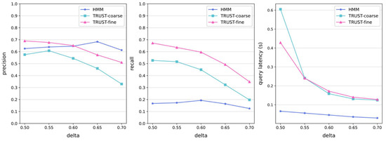 It can be seen that the effect of parameter on the accuracy results was small, and the corresponding curves of all three compared algorithms were close to the level, showing a strong robustness. The reason may be that the results of the scored paths appeared to be polarized, i.e., the correct paths had high scores while the noisy paths had low scores. In this case, the strategy of additional pruning with the monotonicity law on top of the score screening showed a greater advantage. Therefore, the changes in the time curves of HMM and TRUST-fine were small, but the curve corresponding to TRUST-coarse decreased steadily.