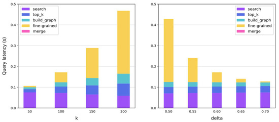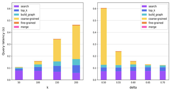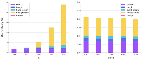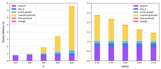 It can be seen that the time distributions of each module for both algorithms were close when k varied, corresponding to the time profile in Figure 6. Among them, the time to search for visual candidates most similar to the first k using the high-dimensional index was very constant. In addition, as k increased, the overhead of computing visual, spatial, and temporal coherence between two pairs increased, which was reflected by a small increase in the top-k computation and graph building modules. On this basis, the exploration space of path selection was expanded, so the corresponding module time had a significant increase.
