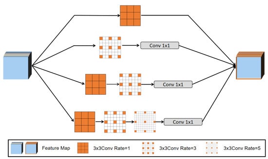 where represents the input feature map, expresses the output feature map, indicates the filter, and denotes the dilation rate when sampling the image. Typically, the standard convolution is a special case of . In contrast, in the multiscale extraction module, the dilated convolution allows us to change this rate to adaptively modify the receptive field of the filter. This process is illustrated in Figure 4.