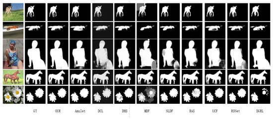 In this part of the study, visual comparisons of saliency-detection results were evaluated. To validate the effectiveness of the devised saliency-detection network, we selected nine existing saliency-detection methods for contradistinctive experiments, namely Amulet [8], DCL [9], DHS [10], MDF [11], NLDF [12], UCF [13], RAS [14], R3Net [48], and DGRL [49]. Three different datasets, including DUTS [43], ECSSD [44], and HKU-IS [45], were tested. In Figure 7, the first column represents the example image, the second column expresses the ground truth of the highlighted salient objects, and the third column displays the saliency map produced by the proposed method. The subsequent columns are the saliency results for each different method. The probability that each pixel point in the image belongs to the foreground is represented its corresponding pixel value. It can be seen from Figure 7 that our devised model produced saliency results nearer to the ground truth.